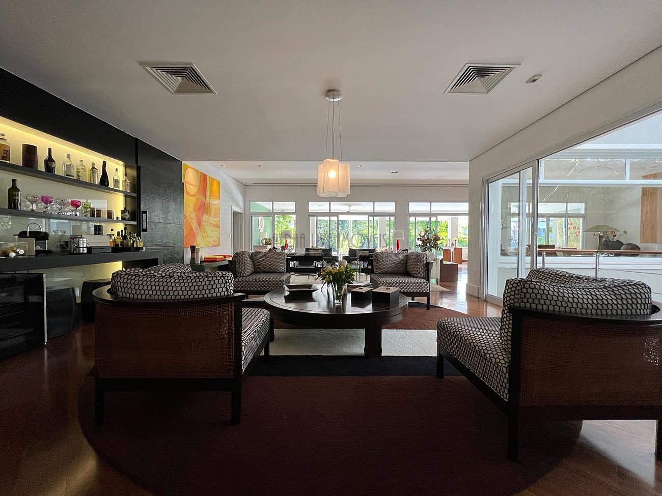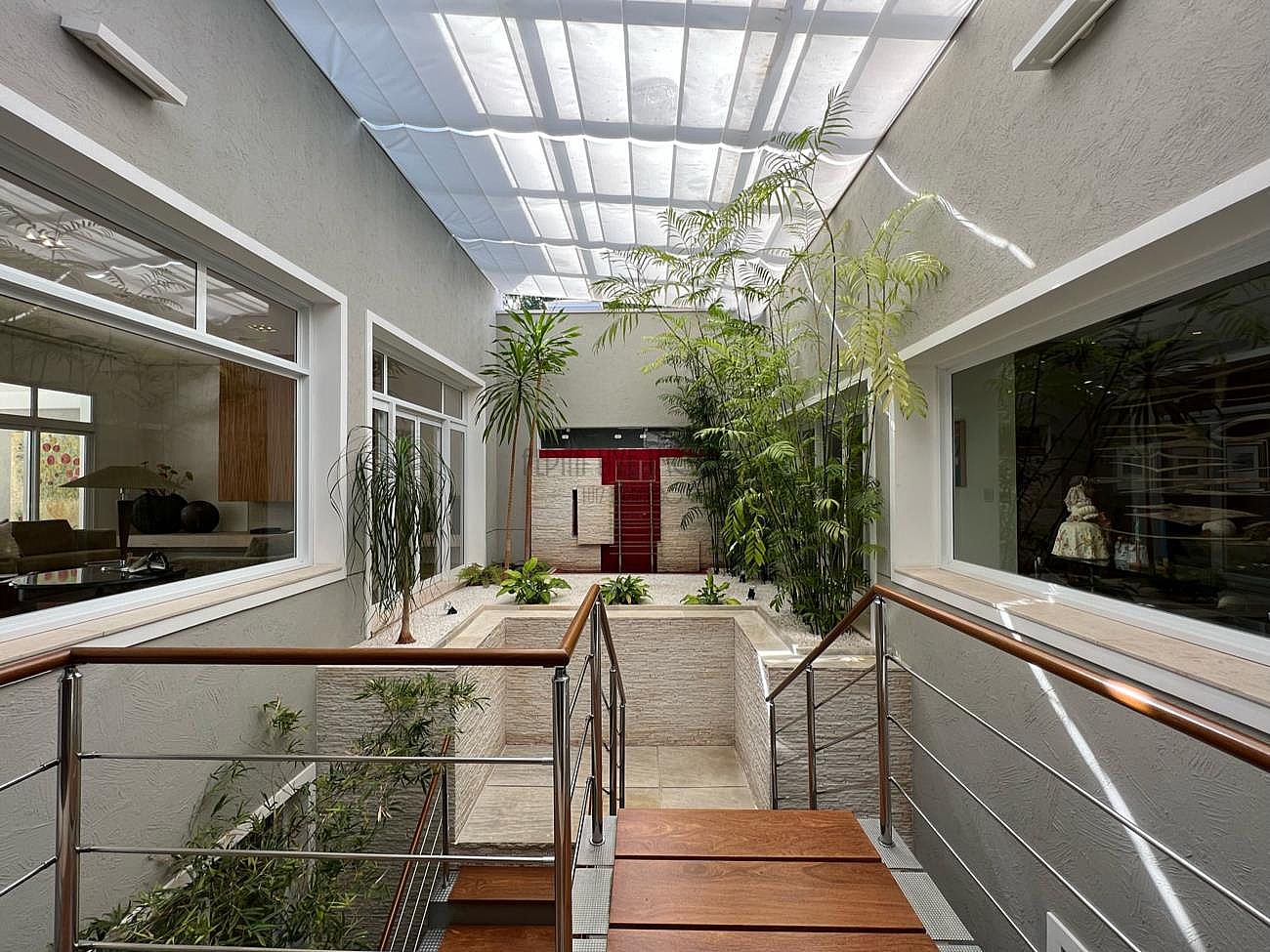 São 5 suítes, sendo a máster com escritório e um espetacular banho com hidromassagem e muita iluminação natural, hall em mármore travertino, trazendo elegância e bom gosto. Ainda no living um lindo jardim interno com cascata. Ampla e completa área de lazer com piscina, espaço gourmet, rouparia, 2 dois ateliês de moda/pintura, academia, adega e depósito. Sistema de ar condicionado, aspiração central, projeto completo de iluminação e poço artesiano.